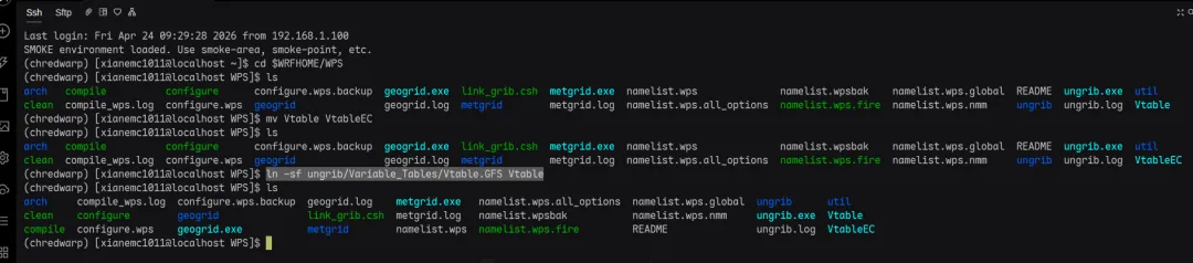 由于我们上次使用的是EC数据进行的预报,所用的Vtable是ECWRF的版本,因此我们先将它改了个名字,同时将GFS的变量对应文件链接成新的Vtable。