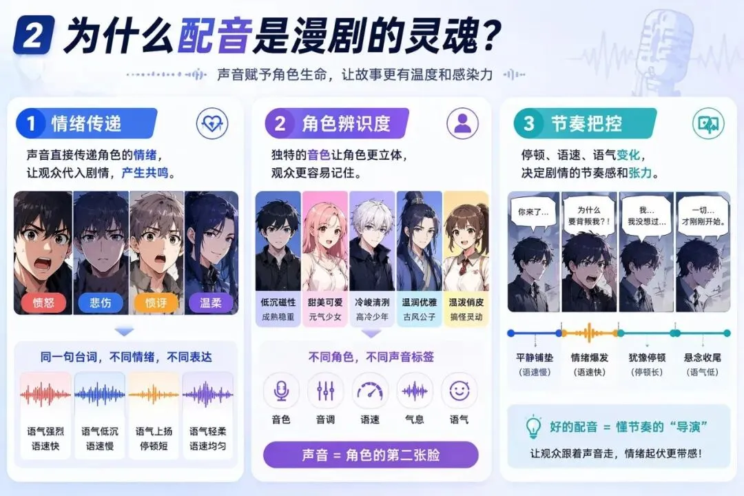 第一,情绪传递。漫剧的核心是让观众入戏,声音是情绪的载体。愤怒、悲伤、惊讶——这些如果靠画面传递,需要好几帧;靠声音,一个语气就够了。
