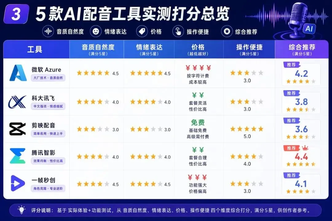 测试标准说明:测试素材是一段200字的漫剧对话,包含愤怒、悲伤、惊讶、调侃四种情绪。评分维度包括音质自然度、情绪表达准确度、价格和操作便捷度,每项10分,满分40分。