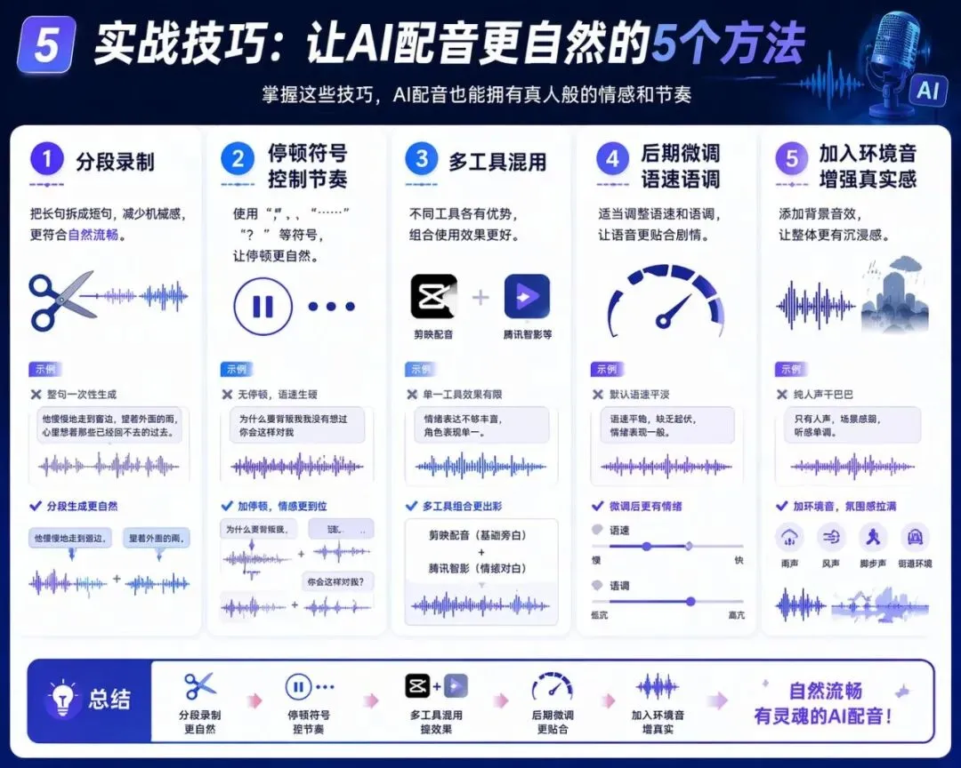 技巧5:加环境音做遮羞布。AI配音最被人诟病的是机械感。解决办法是叠加轻环境音,咖啡馆背景音、街道嘈杂声、风声雨声等。声音有了层次感,AI痕迹就被弱化了。