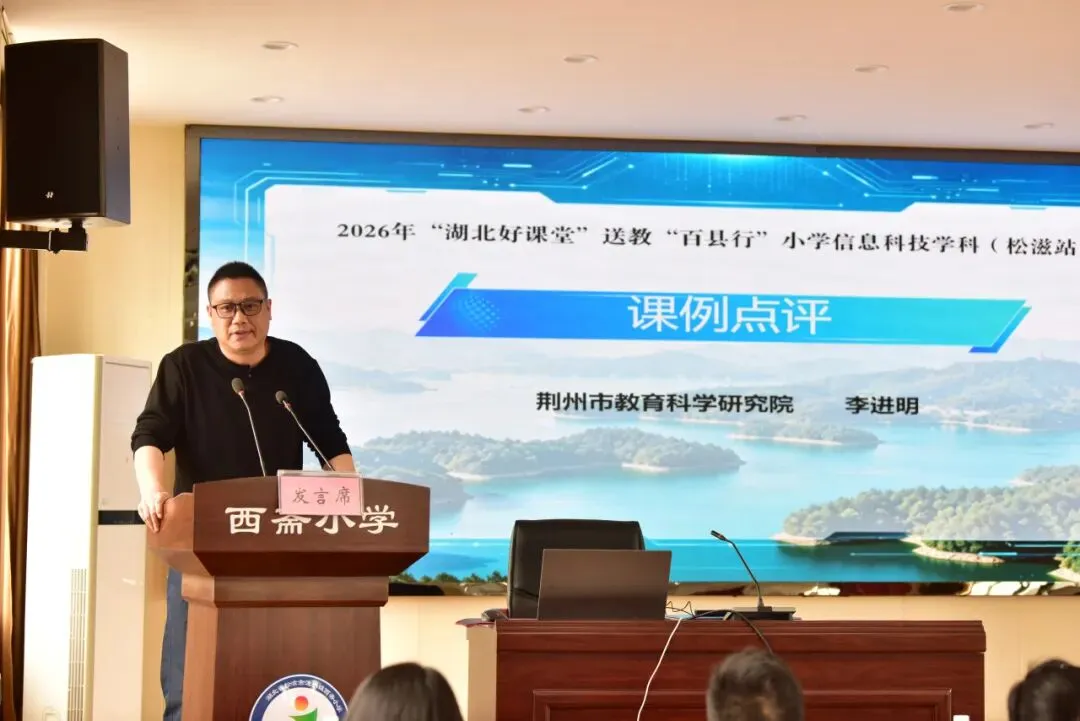 四位授课教师说课后,荆州市教育科学研究院主任李进明对上午四节展示课进行细致、精准点评,充分肯定课堂创新亮点,同时结合教学实际提出针对性优化建议。