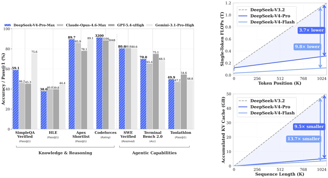 该系列模型全面支持 1M 超长上下文长度和最大 384K 的输出长度。在架构上,其首创了结合 CSA 与 HCA 的混合注意力机制以及 mHC 技术。官方数据显示,相较于前代模型,其在推理和长上下文效率上大幅提升。