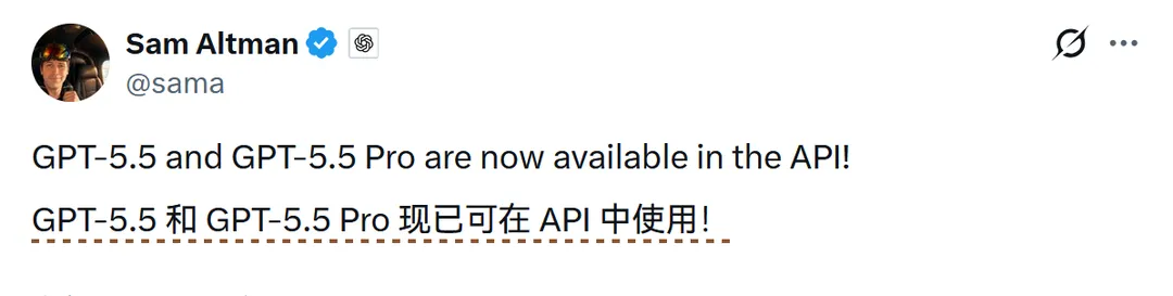 OpenAI 首席执行官 Sam Altman 宣布,GPT-5.5 及 Pro 版现已通过 API 正式可用。