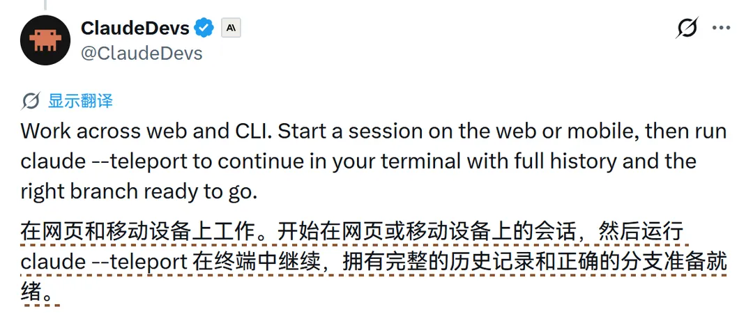 最核心的更新是新增了跨平台工作功能。用户在网页或移动端开启会话后,可通过运行 claude --teleport 命令无缝切换至终端(CLI)继续操作,并自动保留完整的历史记录与正确的分支状态。