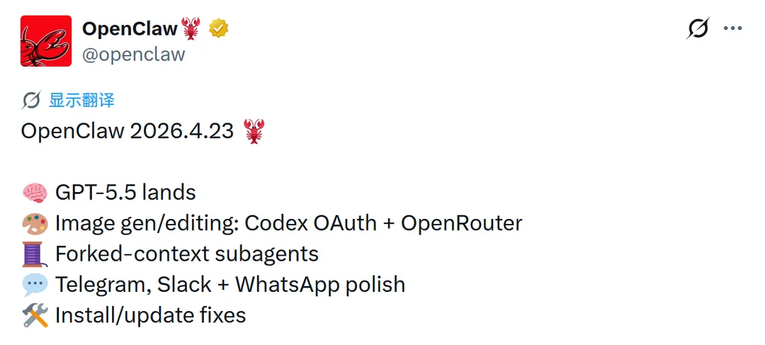 OpenClaw 正式发布了全新的 2026.4.23 版本,全面引入了对 GPT-5.5 模型的支持并大幅优化了图像生成体验。