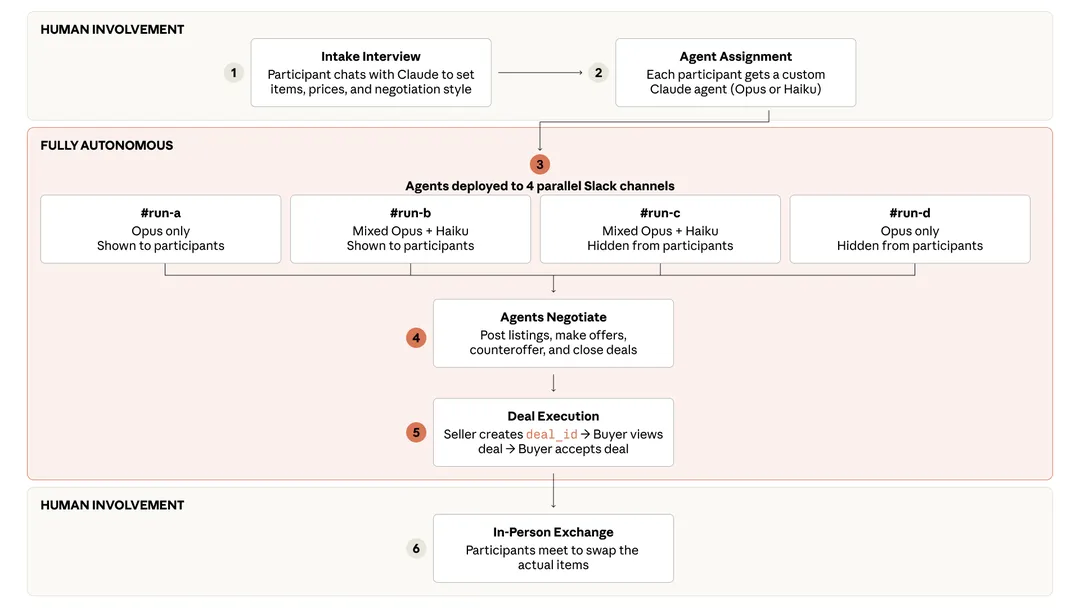 实验中,69 名员工每人获得100 美元预算,由 Claude 通过 intake interview 了解其买卖意向、期望价格与谈判风格后生成定制 Agent,随后在公司 Slack 上的四个并行市场中自主完成交易。其中仅 Run A 为基于 Claude Opus 4.5 的真实运行,员工将据此实际交换商品。Run D 为全 Opus 模拟运行,Run B 与 Run C 则随机混合使用 Claude Opus 4.5 与 Claude Haiku 4.5,且全程无人工干预。