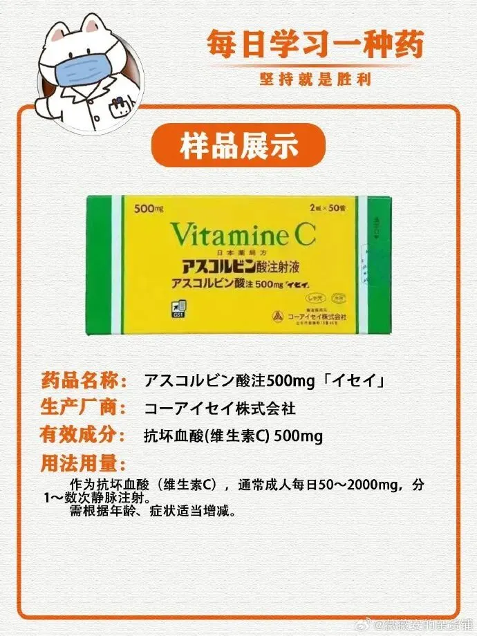 日医工VC美白针抗坏血酸即维生素C。典型的缺乏症为坏血病,可引起出血倾向增大、骨骼与牙齿发育迟缓、抗体生成能力及创伤愈合能力下降。虽然本药对这些疾病和症状有疗效,但其生理意义和作用尚未完全明确。有报告显示,其作用包括参与胶原蛋白生成、增强毛细血管抵抗力、缩短血液凝固时间从而改善出血倾向、参与肾上腺皮质功能(防止应激反应)、抑制黑色素生成等。2毫升 50支(玻璃安瓿)。