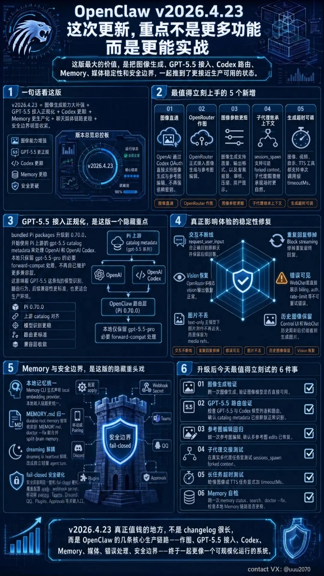 v2026.4.23 真正值钱的地方,不是 changelog 很长,而是 OpenClaw 的几条核心生产链路——作图、GPT-5.5 接入、Codex、Memory、媒体、错误处理、安全边界——终于一起更像一个可规模化运行的系统。