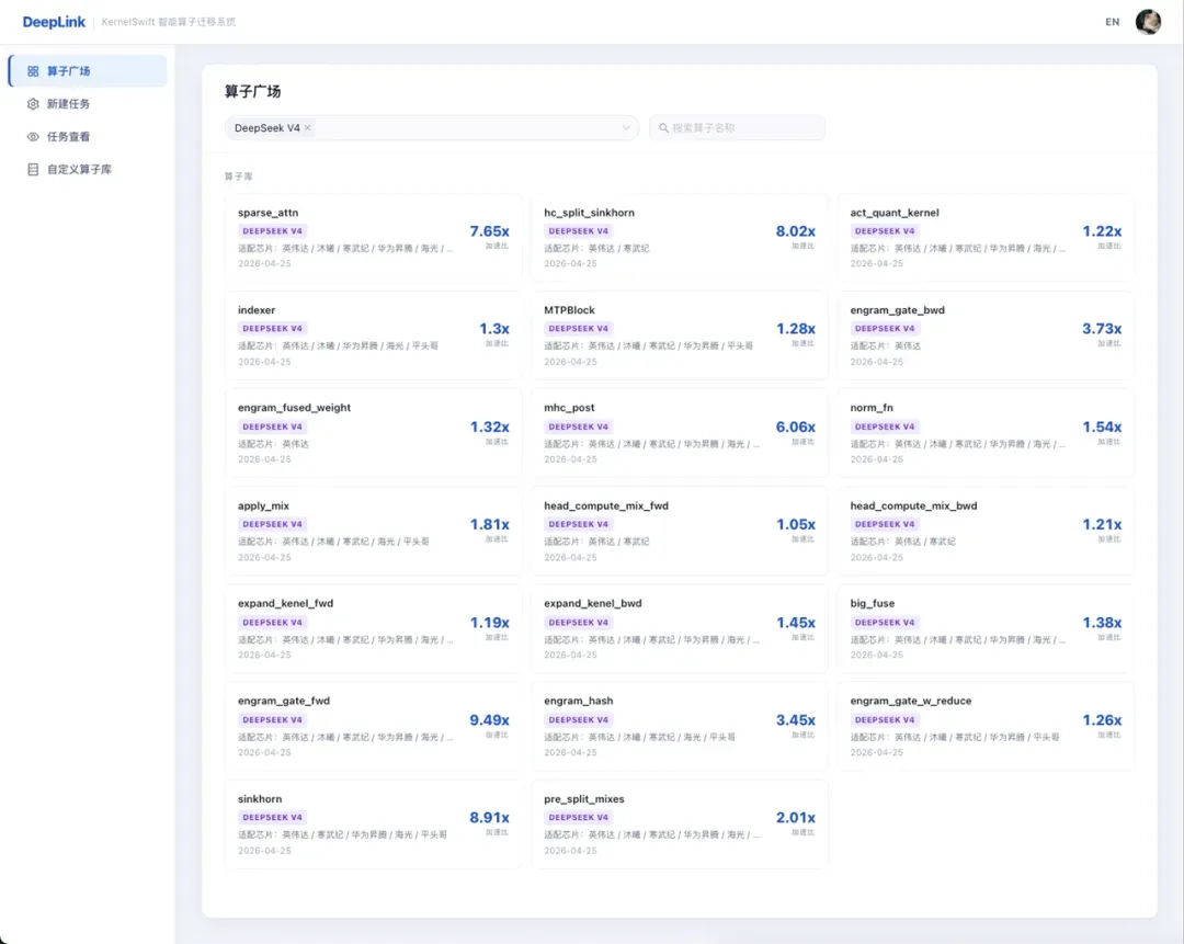 今日DeepSeek-V4预览版本正式发布并开源,上海AI实验室DeepLink团队凭借大模型驱动的智能算子迁移系统KernelSwift,率先完成DeepSeek-V4核心算子在昇腾、沐曦、摩尔线程、海光等多家国产芯片的0Day适配,算子平均通过率约80%,实现了顶级大模型发布与国产算力适配同步落地,为开发者带来无缝部署体验。作为支持多元算力的智能系统,KernelSwift可提供指定芯片的Triton算子定制优化服务,凭借高级抽象与自动算子生成能力,将原本需要数月的适配周期压缩至小时级,能为多元国产AI芯片提供开箱即用的高性能算子支持,同时支持全链路支撑,摆脱单一生态绑定。本次适配全程无人工干预,21个核心算子中,KernelSwift实现NV芯片100%正确性,核心算子性能相比tilelang提升1.2倍以上;国产芯片原生平均达75%以上正确性,平均加速比达3.4x,仅需少量人工修改即可实现100%正确性,大幅提升了开发迁移效率,相关算子也预备上线官方算子库供开发者取用。