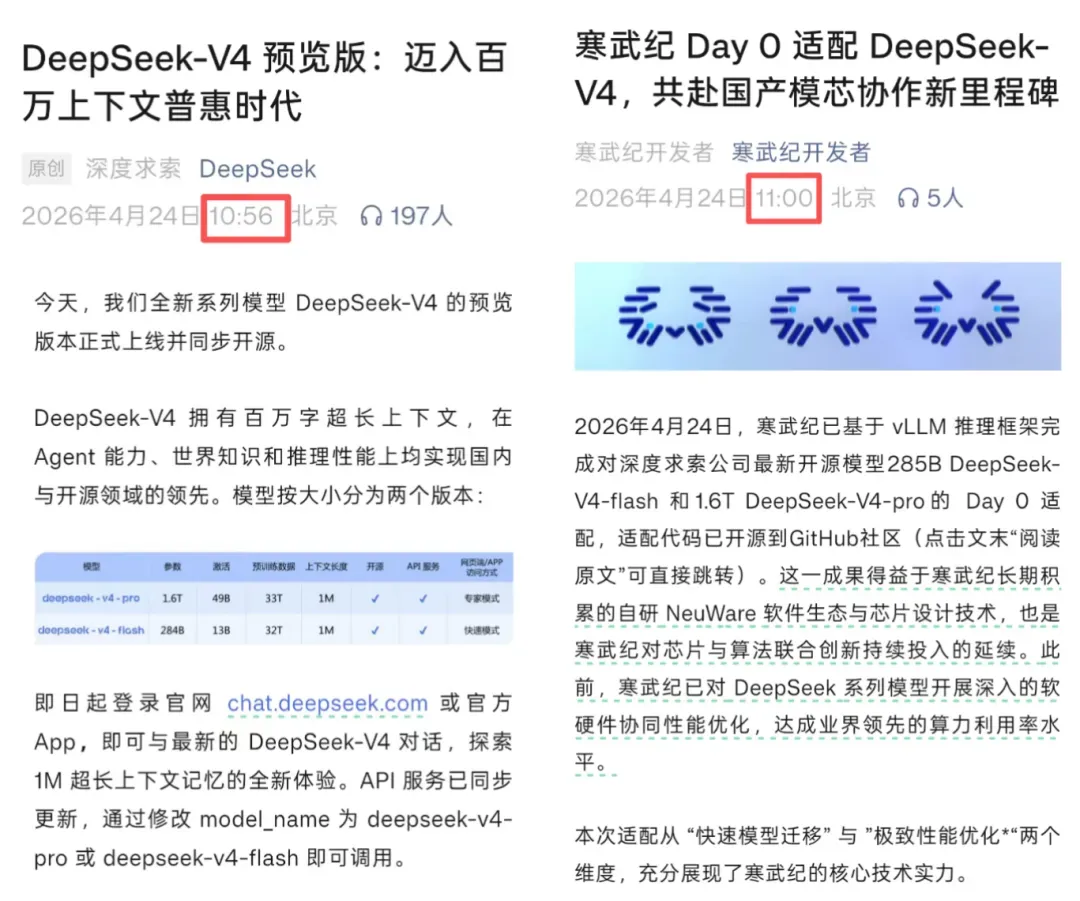 第一时间,寒武纪原生适配DeepSeek-V4!两大国产之光再次强强联合