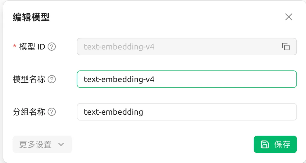以阿里百炼云中的 text-embedding-v4 为例,配置模型ID和名称: