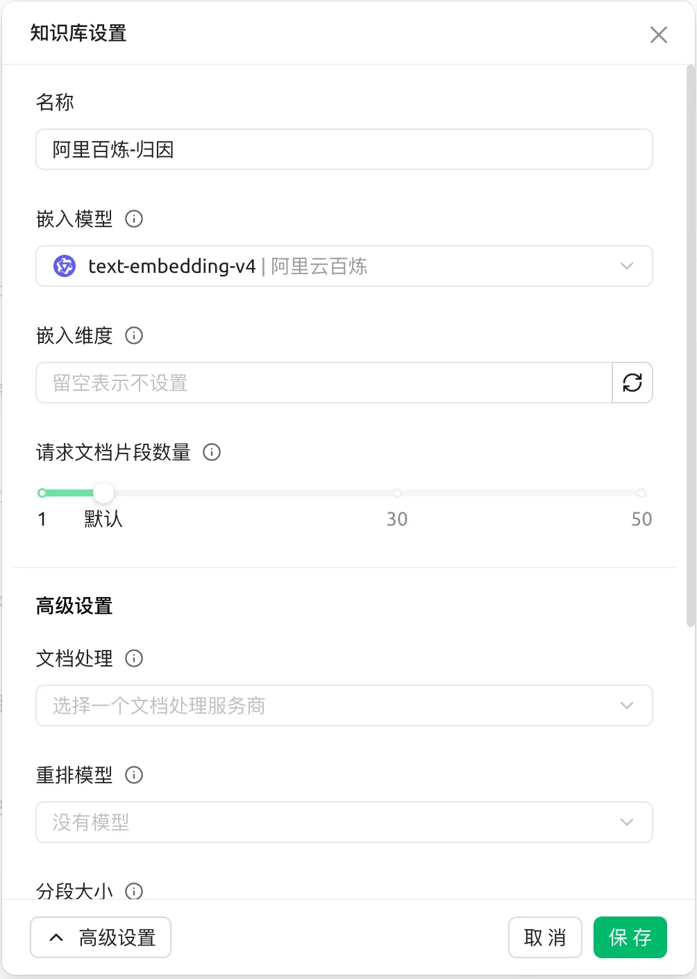 设置知识库名称、选择嵌入模型、配置文档处理参数:
