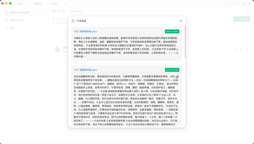 上传文档后,可以直接搜索关键词,系统会展示匹配度得分,帮助你快速定位相关内容: