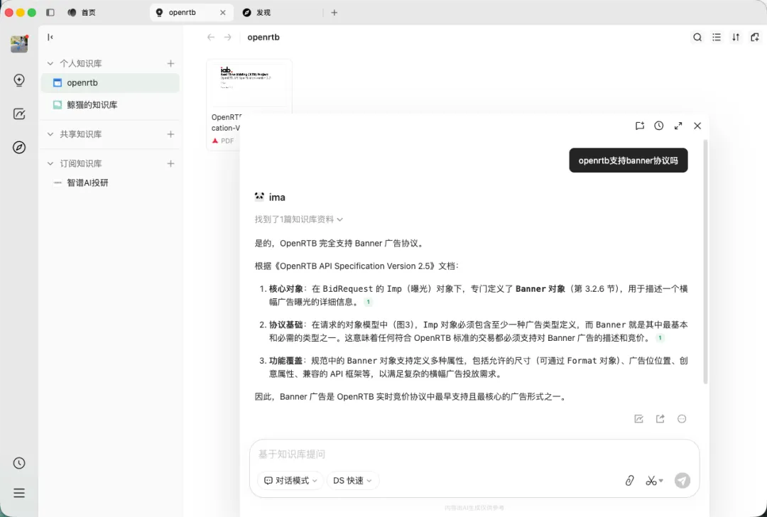 选择知识库后,AI助手会依据知识库内容作答,还能看到具体引用的文档来源: