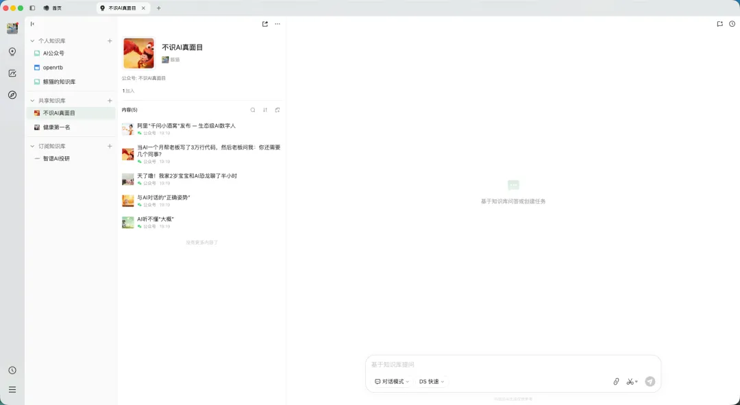 文章导入完成后,可以生成自己的知识库,结合大模型进行智能搜索: