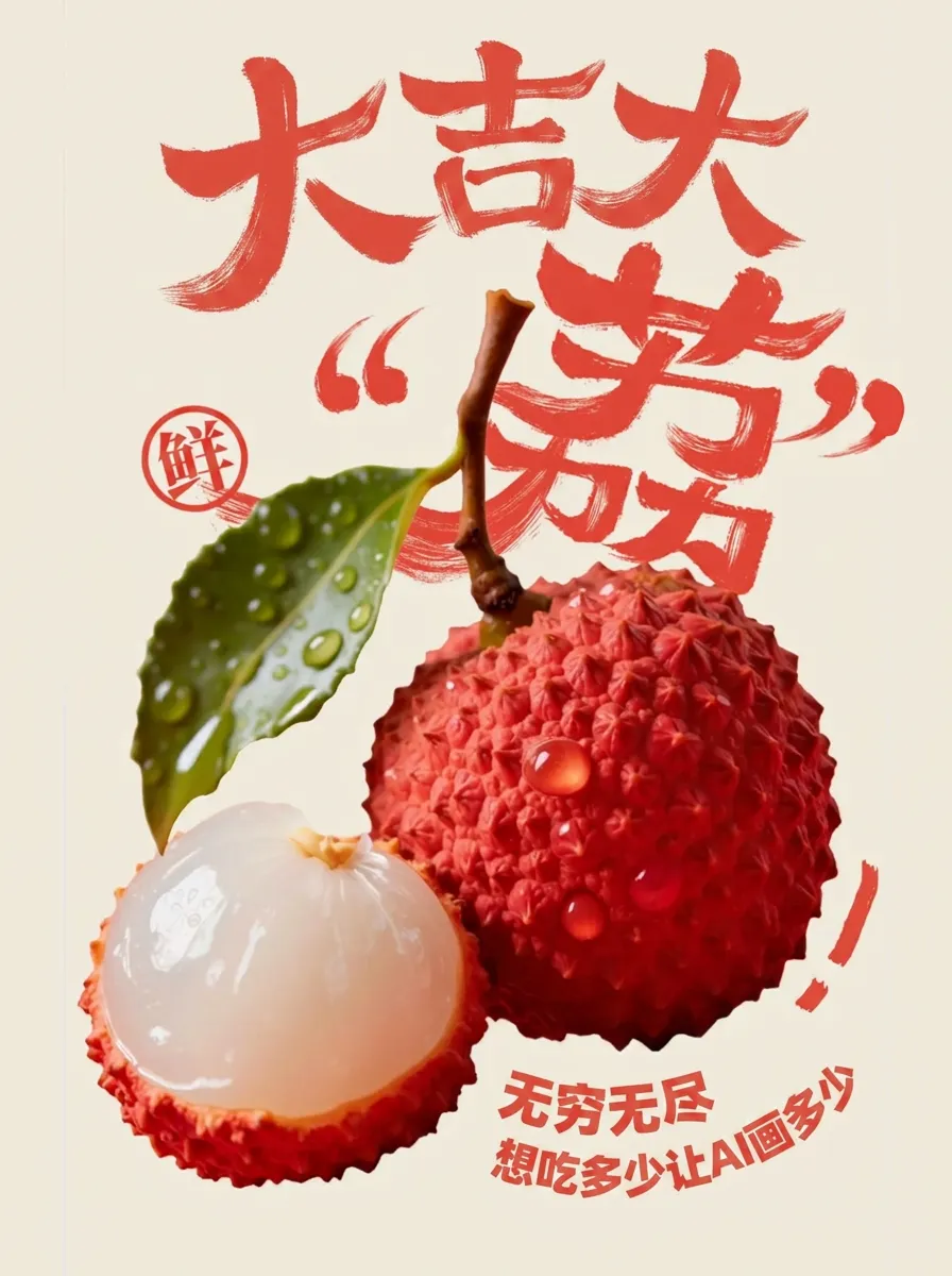 脑子里想要的画面很清晰:饱满欲滴的荔枝,剥开一颗、露出剔透果肉、汁水正在下落的那一瞬间;画面要有节庆感,又不能土;再加上一个谐音梗——大吉大”荔”,顺道宣传 AI。