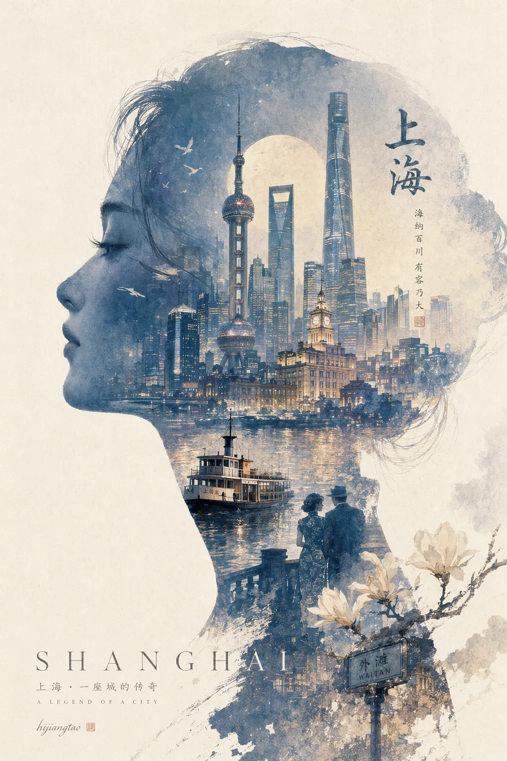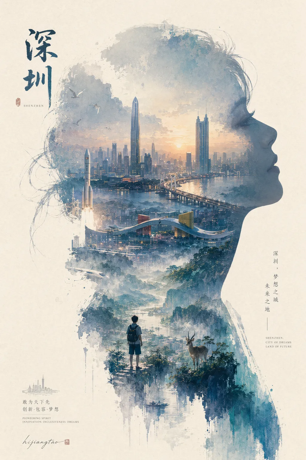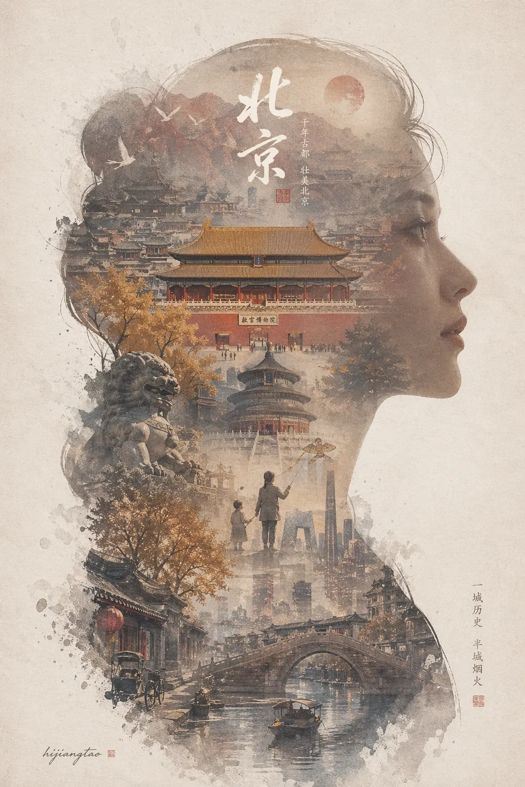 我脑子里想要的画面是这样的:一张巨大优雅的人物侧脸剪影作为外轮廓,剪影内部——不是简单贴图,而是自动生长出这座城市最标志性的建筑、场景、道具、氛围。整体是电影海报与梦幻水彩插画的融合,柔和的空气透视、轻雾化过渡、纸张颗粒、边缘飞白、大面积留白,最后低调地落一个作者签章。