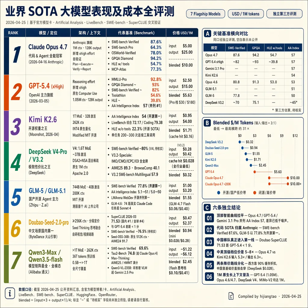 我想要的最终产物,是一张”信息密度足够高、一图胜千言“的信息图:多个旗舰模型横向对比,每家覆盖架构/上下文、代表性 benchmark、输入输出定价;旁边要有关键基准横向对比的小表、Blended 定价的散点图,最后落在六条独立结论上。标注数据口径、第三方交叉验证、公开来源可追溯。