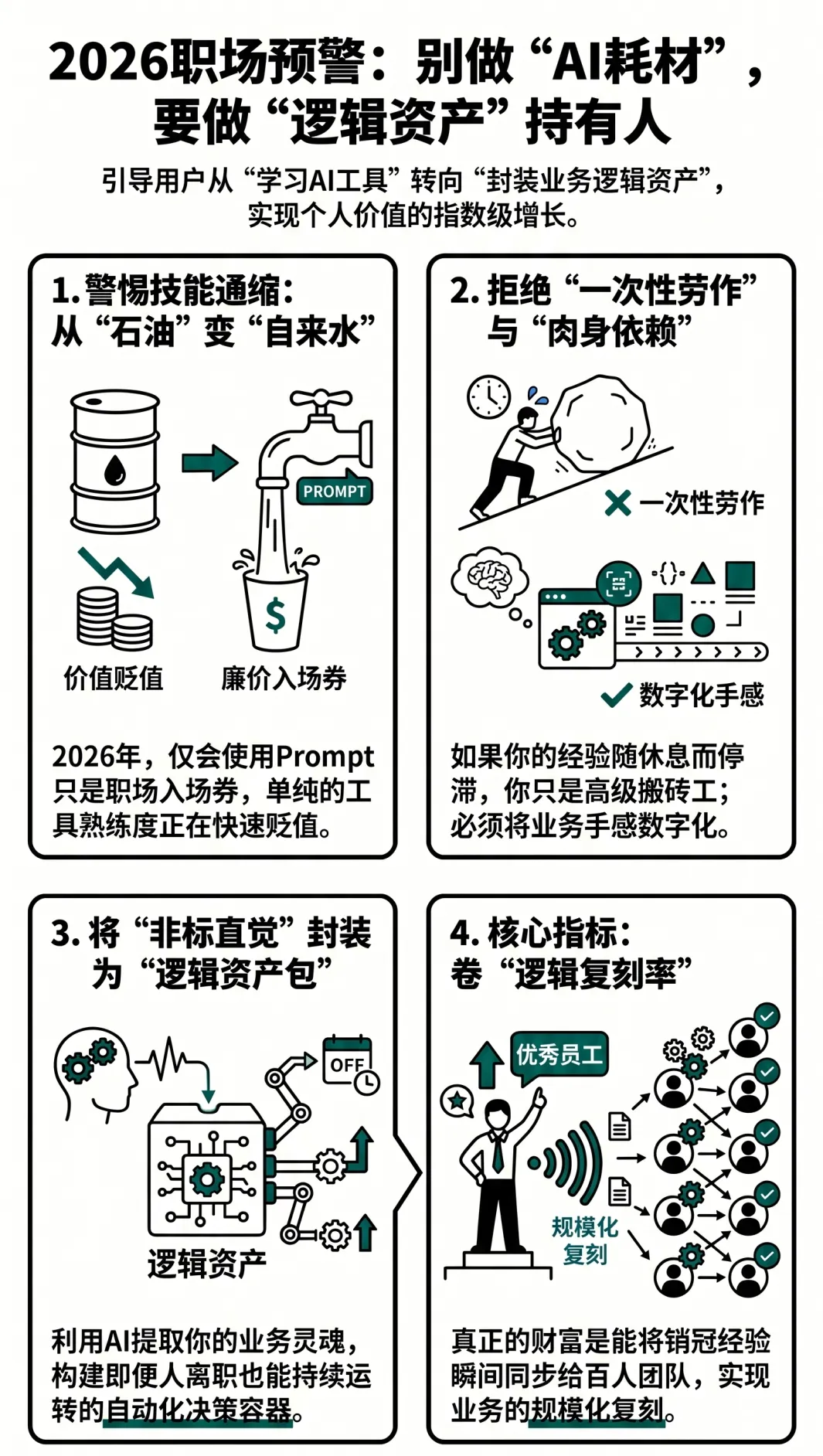 如果你还在卷“如何写出更好的Prompt”,你本质上是在跟算法赛跑。算法每优化一次,你之前的努力就贬值一次。这种“勤奋”的终点,是高效率的平庸。在2026年,最便宜的就是这种“会用AI干活的人”。