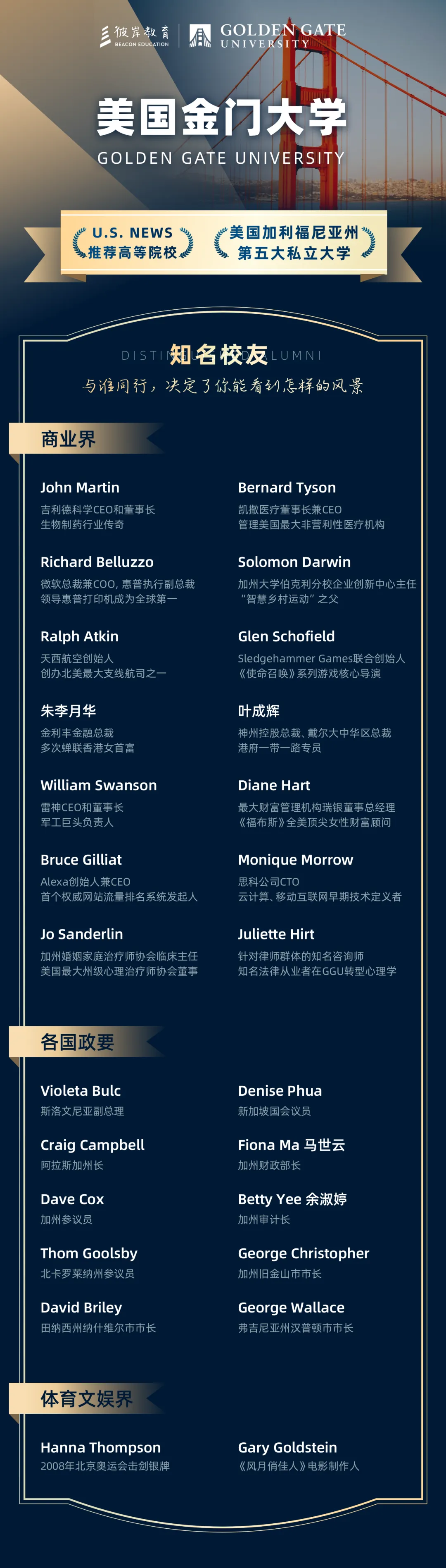 美国金门大学(GGU)成立于1901年,是位于美国加利福尼亚州的一所知名大学。