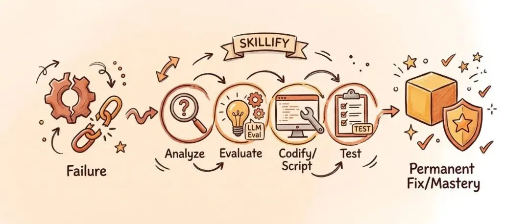 这套做法叫「技能化」(Skillify)。核心思想很简单:每一次失败都变成一项永久技能,带完整的测试。Bug 从结构上变得不可能复发。