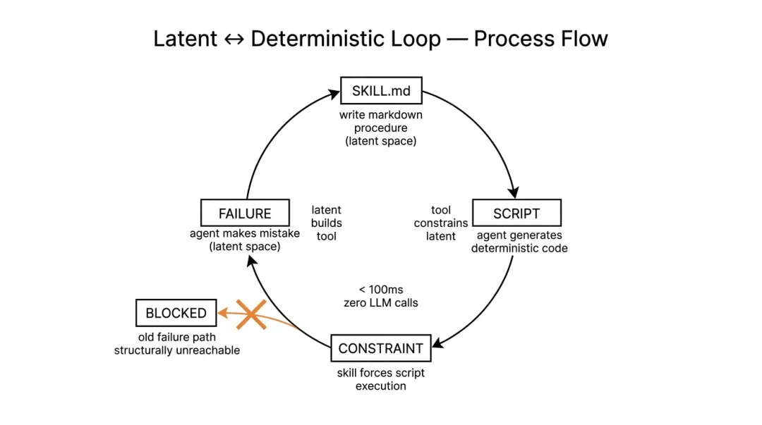 形成了一个闭环:潜在空间用来写确定性工具,确定性工具反过来约束潜在空间。模型的智能创造了约束,约束防止了模型犯蠢。旧的失败路径从结构上被封死。