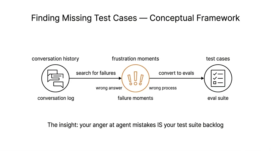他分享的最赤裸评估启发式:翻一翻你的对话记录,找出你骂脏话的地方,那些就是你漏掉的测试用例。