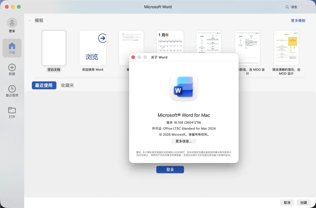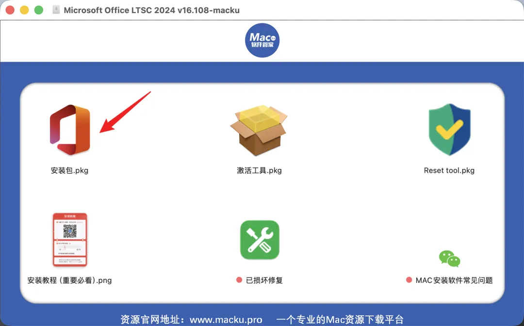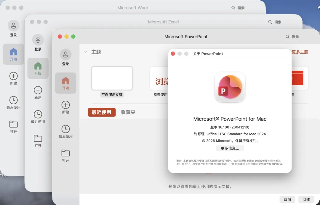 软件介绍Microsoft Office2024 包含了新版本的 Word、Excel、PowerPoint 以及现有的 OneNote 和 Outlook 等组件组成,完美支持 OS X El Capitan、Yosemite 以及 Retina 高分辨率视网膜屏幕。支持包含简体中文在内的多国语言、支持全屏模式、支持沙箱、集成 OneDrive 云存储、支持在线协同编辑功能。Office的各个应用程序都有各自独特的功能和特点。例如,Word是一个文本编辑器,用户可以用它来创建和编辑各种文档,包括文字、图像、表格等;Excel是一个电子表格应用程序,用户可以用它来处理和分析数据,制作各种图表和报表;PowerPoint则是一个演示文稿工具,用户可以用它来创建和分享演示文稿,用于会议、演讲等场合。除了这些常用的应用程序外,Office还包括其他一些组件,如Outlook、Access等。Outlook是一个电子邮件客户端和管理器,用户可以用它来管理电子邮件、日历、联系人和其他个人信息;Access则是一个数据库管理工具,用户可以用它来创建和管理数据库。Office还提供了许多高级功能和特性,如云存储、在线协作、智能数据分析等。通过这些功能,用户可以更加高效地完成各种办公任务,提高工作效率和决策能力。常见问题1.Mac安装软件常见问题集合(腾讯文档):https://docs.qq.com/doc/DUFRLTWFlQnlWcW9p