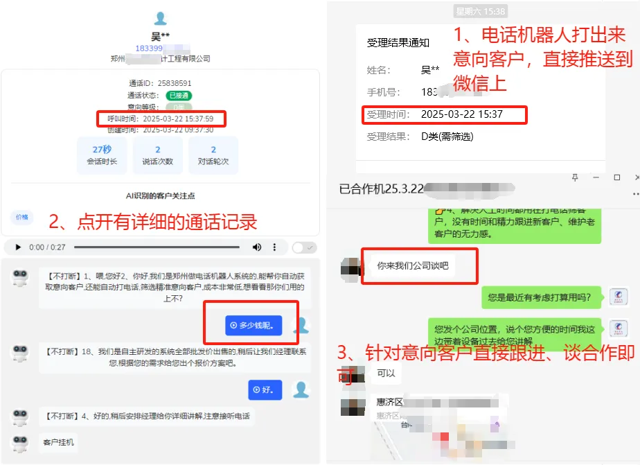 ai智能电话销售机器人是现在市面上,帮你代替真人自动拨打电话,自动筛选客户,帮你这边把打出来的意向客户自动推送到你的微信上面。