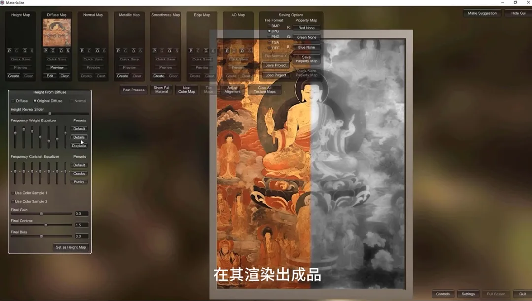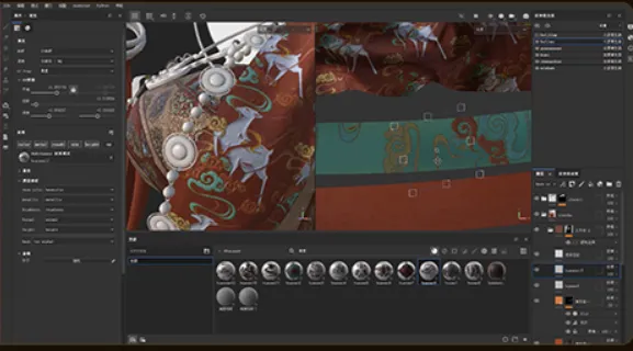 利用Substance 3D Designer节点编辑制作丝绸刺绣纹理,以及人类的皮肤贴图细节,利用AI工具辅助输出敦煌模型PBR贴图,用Substance 3DPainter来进行贴图细节修饰绘制。