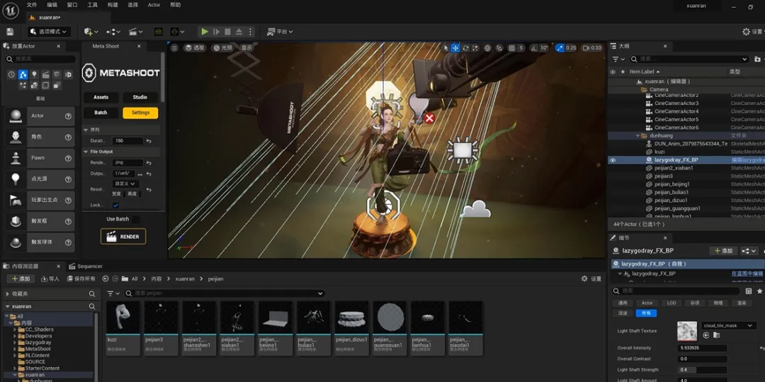 介绍如何利用UE利用灯光系统营造敦煌神女气氛,将敦煌元素场景合成提升成品质量,再通过AI修图合成渲染出图。