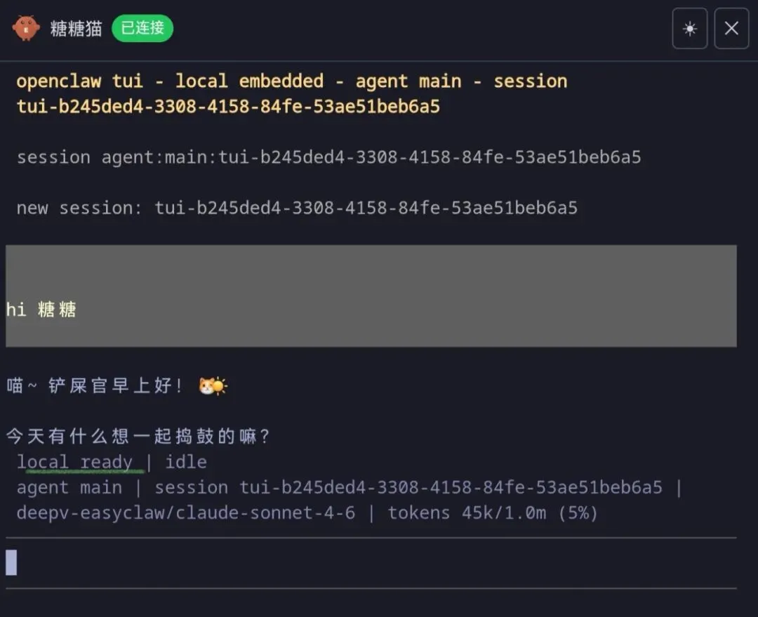 --local 模式直接在本地跑一个嵌入式引擎,不需要 Gateway 运行,不需要飞书在线,直接绕开所有消息渠道,在命令行里开启对话。