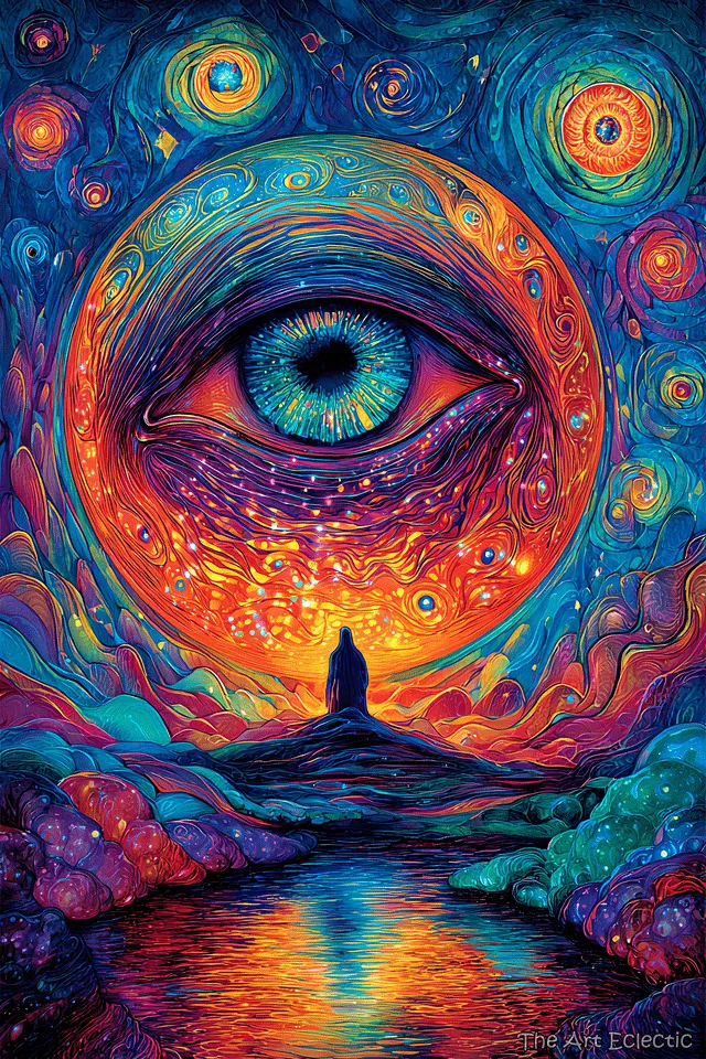 aiArt 板块公开了一幅名为 Eye of Cosmos(宇宙之眼)的数字作品。画面中央为巨大的蓝绿色眼睛,背景旋转着无数小眼与螺旋,色调融合梵高式笔触;前景一名黑色剪影站立于发光河流前,仰望巨眼。