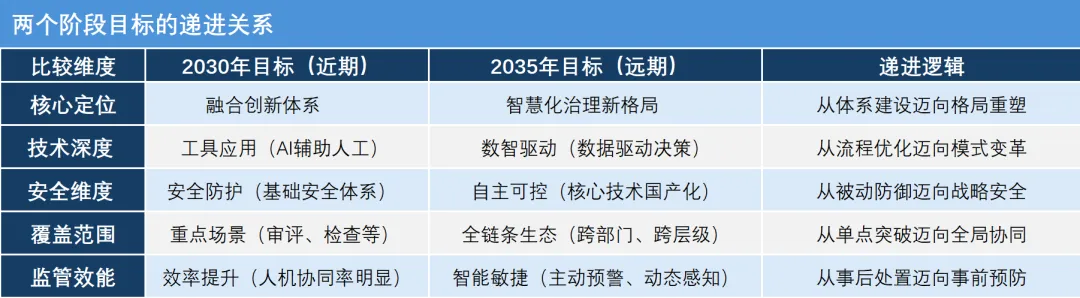 到2035年,基本形成智慧化治理新格局。具体包括:由2030年的辅助应用升级为数智驱动,数据和算法将成为决策的核心依据;特别强调自主可控,确保核心算法、数据和系统不受制于人;强调“生态协同”,形成政府、企业、社会多方联动的治理体系。