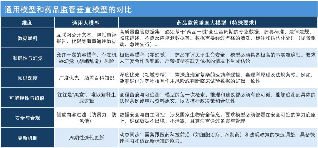 • AI不再是聊天机器人,而是具备了药品监管专业知识的专用工具。与通用语言类大模型相比,药品监管垂直大模型的区别在于底层数据库来源,整体具有高度封闭性和极强的专业性。