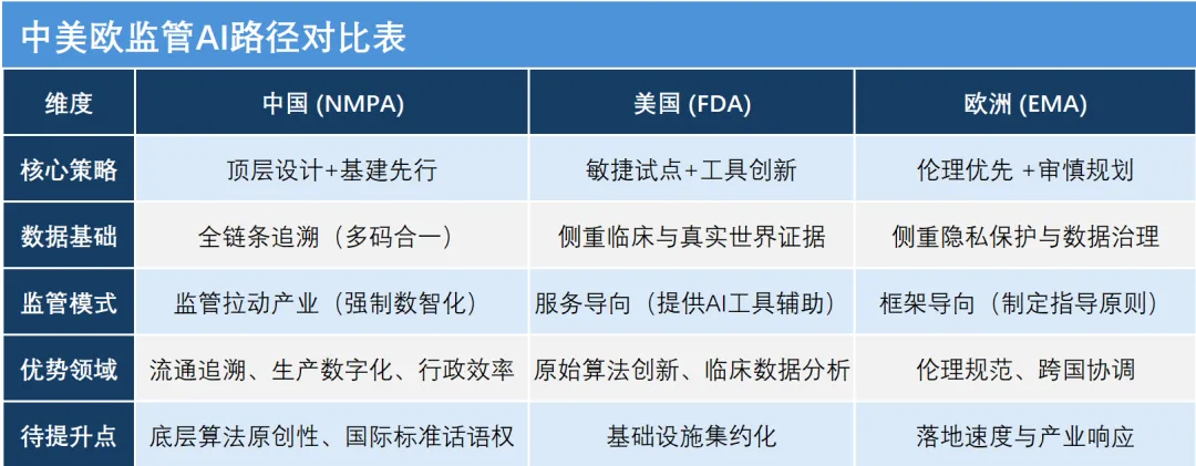 • 相比美国FDA的“敏捷试点”和欧洲EMA的“伦理审慎”,中国正在探索走一条顶层设计先行、基础设施集约化、监管与产业协同的独特道路。