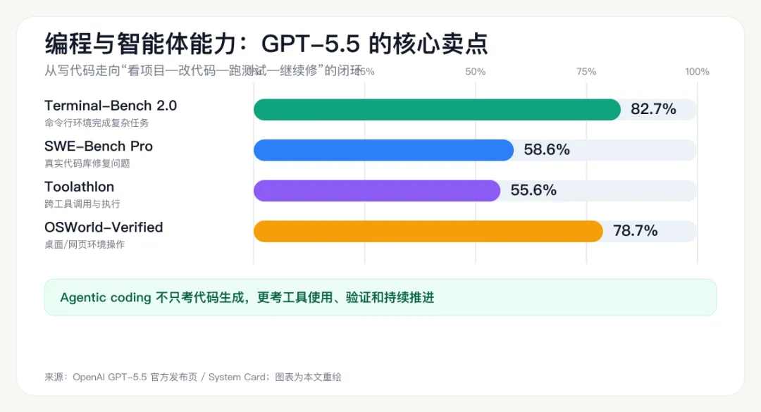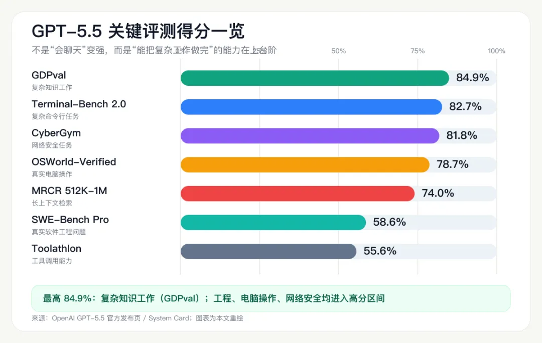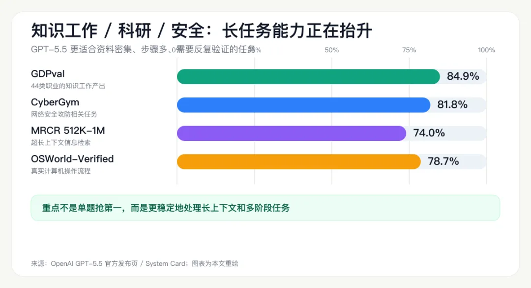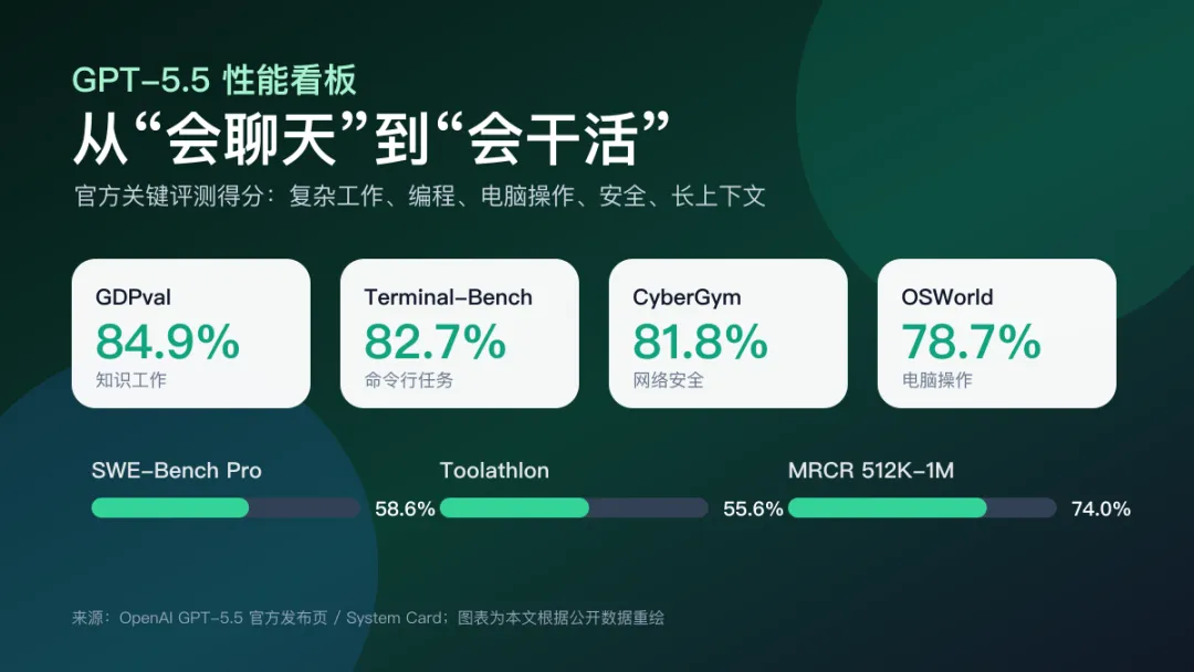 这就是为什么OpenAI说GPT-5.5特别适合 agentic coding、computer use、knowledge work、early scientific research。