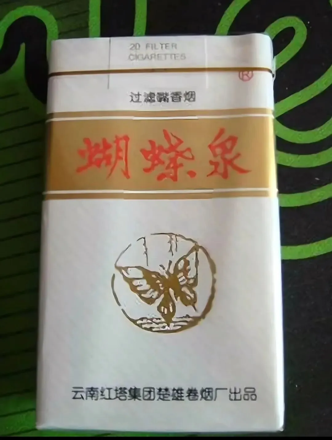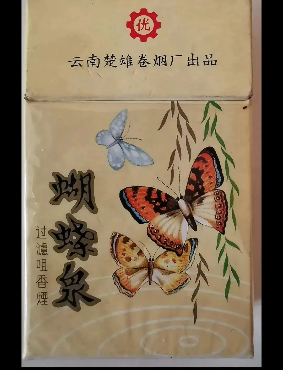 蝴蝶泉有两款经典包装:一款是简约的白金色,印着蝴蝶图案;另一款是复古的米黄色,画着彩蝶与垂柳。当年的广告语 “蝴蝶泉边好风光”,让它成为很多人心中的 “云南符号”。