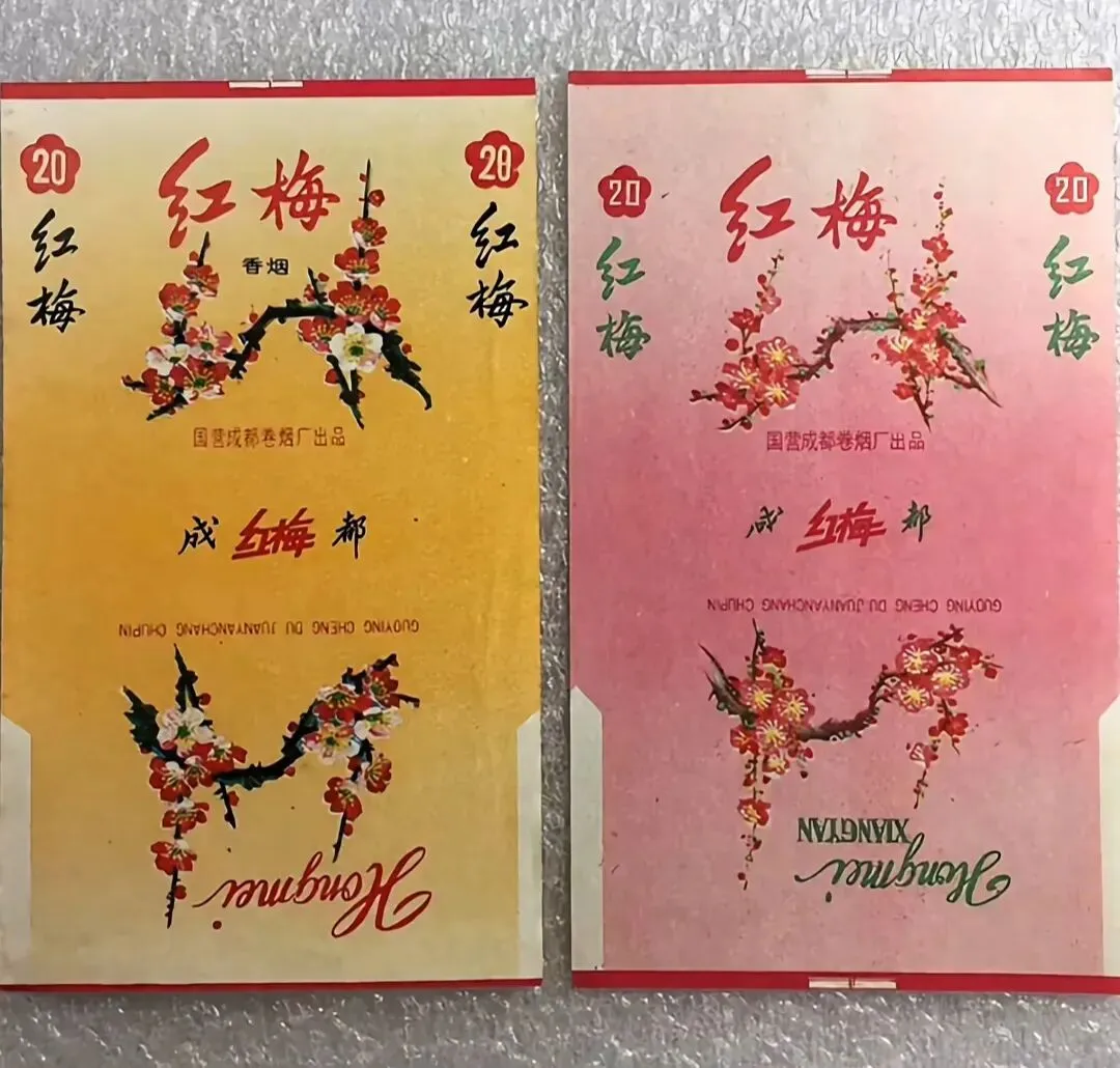 黄、粉两款包装,印着盛开的梅花,红梅是成都卷烟厂的代表款。它的价格亲民,味道清淡,是很多南方家庭的 “日常口粮”。