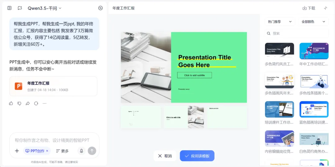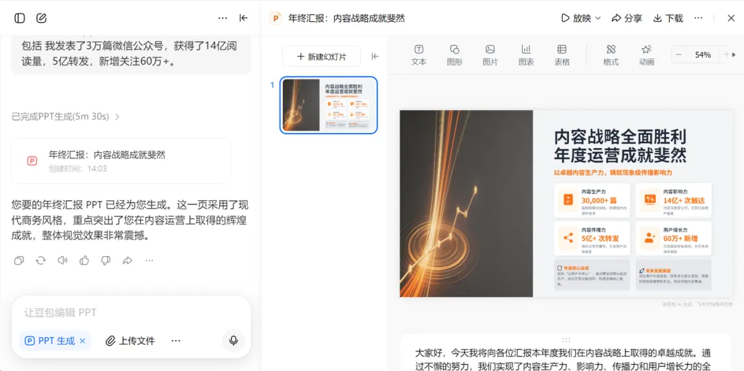 看起来这个生成的还不错,不过实际业务场景复杂之后,多次使用就会发现它并不稳定,PPT 内容排版会错乱。
