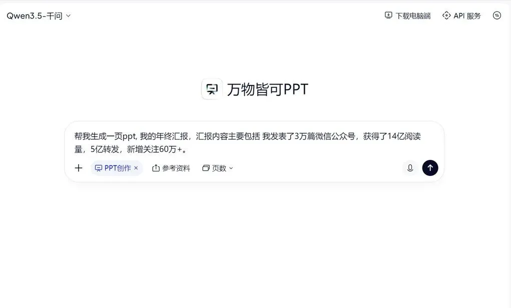帮我绘制一页 PPT,我的年终汇报,汇报内容主要包括 我发表了 3万篇 微信公众号,获得了 14亿 阅读量,5亿转发,新增关注 60万+。