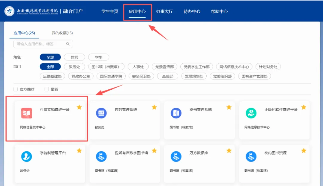 登录学院 “融合门户”(https://portal.xatzy.com),进入 “应用中心”,找到并打开 “可信文档管理系统”。