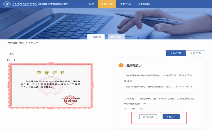 告别跑腿!我校可信文档管理系统上线啦!证书证明一键打印超方便!
