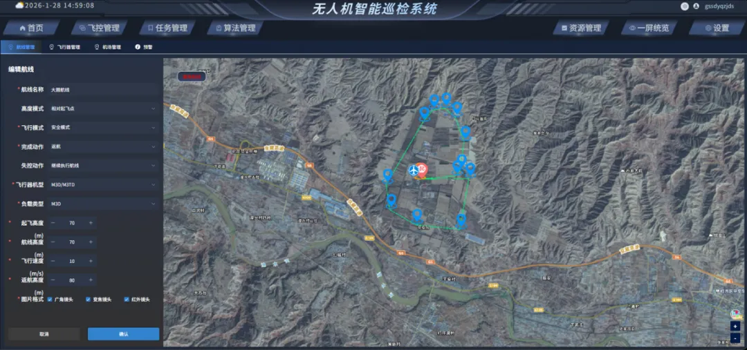 平台支持适配电力设备布局的定制化航线规划,可通过地图绘线、参数自定义、外部航线导入等多种方式设置巡检路径。无人机可自主完成起飞、定点悬停、高清拍摄、巡航返航全流程作业,无需人工实时操控。能够精准覆盖高空设备、远距离线路、复杂地形盲区等人工难以抵达的区域,真正实现全域无死角巡检,大幅提升巡检覆盖完整性。