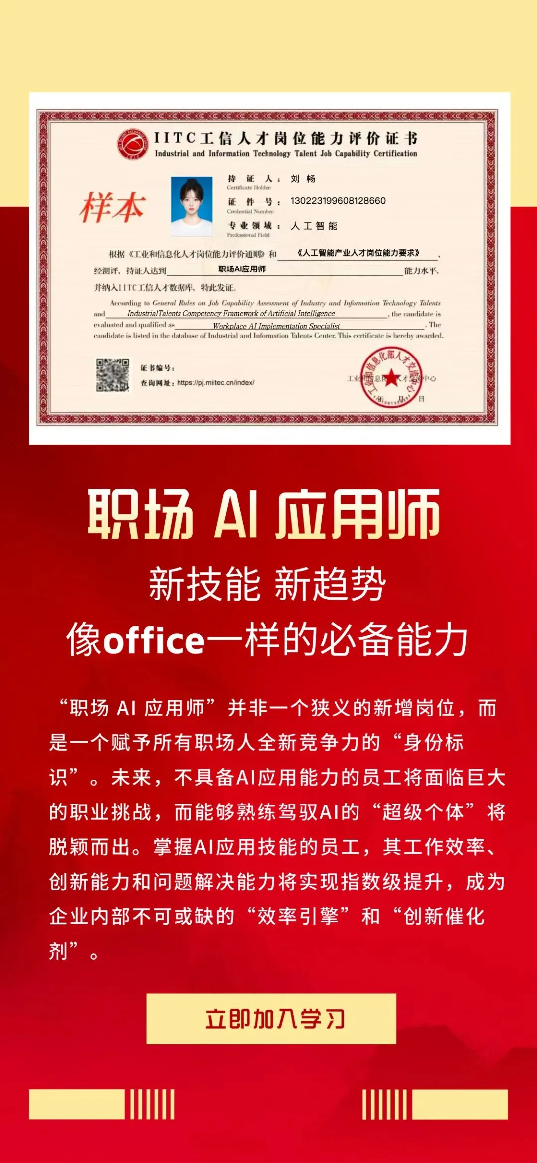 职场 AI 应用师认证,是 ** 工业和信息化部人才交流中心(IITC)** 推出的国家级岗位能力评价证书,也是目前职场人拥抱 AI、实现效率倍增的权威 “通行证”。