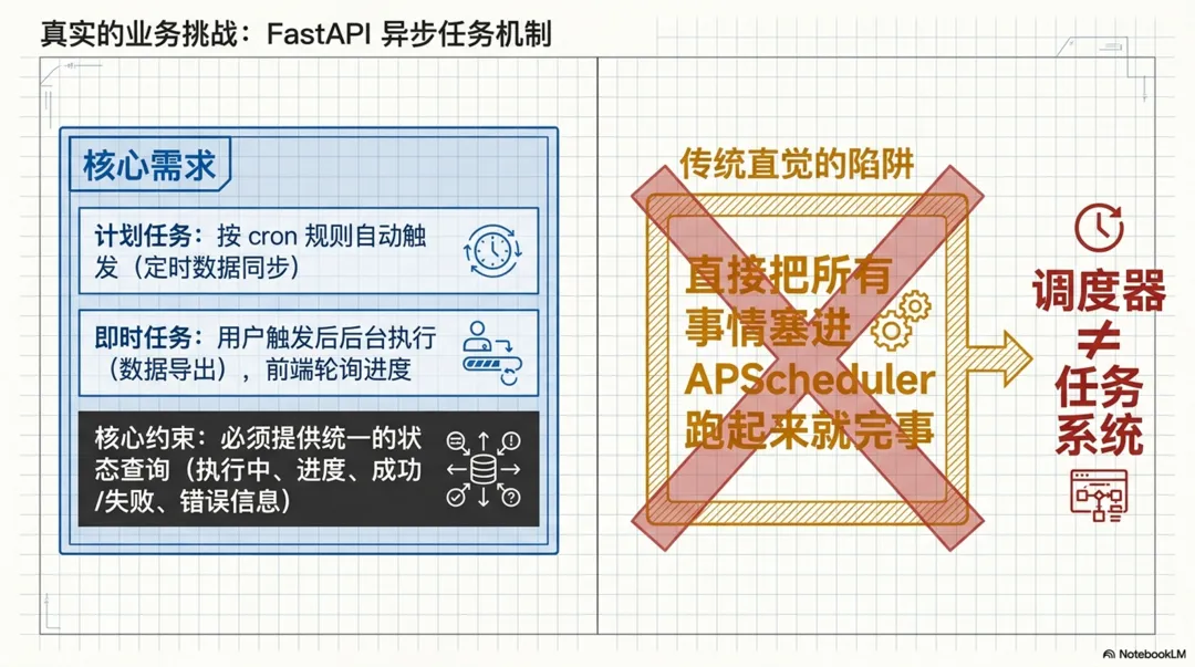 这次事情本身不算大,核心目标是在一个基于 FastAPI 的普通业务系统里,补上一套统一的后台异步任务机制,同时支持两类需求:一类是按时间规则自动触发的计划任务,另一类是用户发起后立即进入后台执行的异步任务,例如导出、导入这类典型场景。