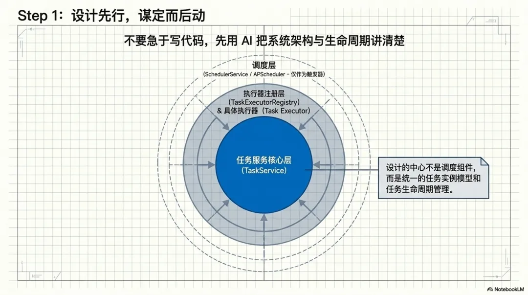 首先,先讨论设计,再进入代码。先把问题抽象清楚,再让 AI 落地实现,效果会稳很多。这次后台任务机制之所以做得顺,是因为一开始就把几个关键判断说清楚了:这是统一任务框架问题,APScheduler 只是触发器,核心是 TaskService,统一围绕任务实例做状态、进度、结果管理,先满足单实例阶段,不做过度设计。