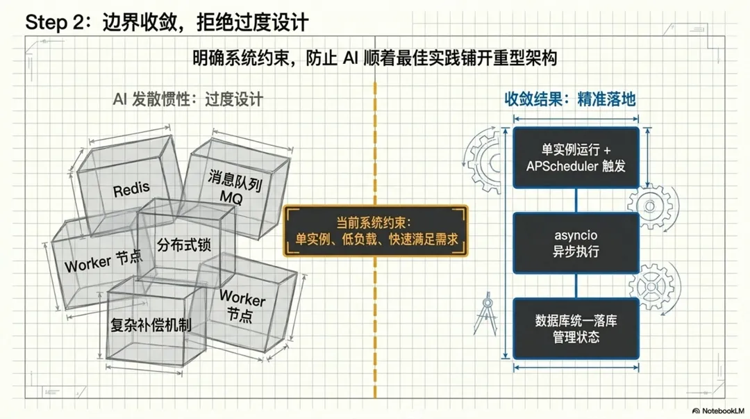 因为很多 AI 生成的技术方案,往往结构上没有问题,但很容易过度设计。你如果不给它明确边界,它会顺着“最佳实践”的惯性,把 Redis、消息队列、分布式锁、Worker、补偿机制、高可用全给你铺开。