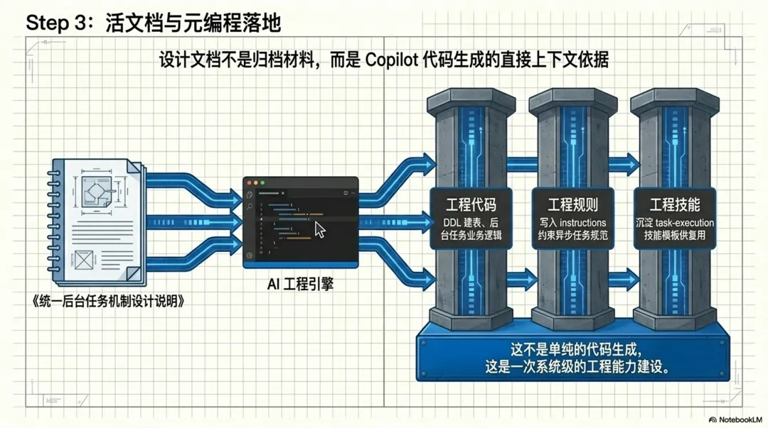 我用的是 VS Code,把这份设计说明文件直接加到上下文里,然后给 Copilot 一个非常明确的任务:参考这个设计方案,在当前系统代码基础上实现后台任务机制;同时把与这套设计相关的后续编码规范补充到 instructions 里;再把新增异步任务时需要复用的方法整理成 skill。