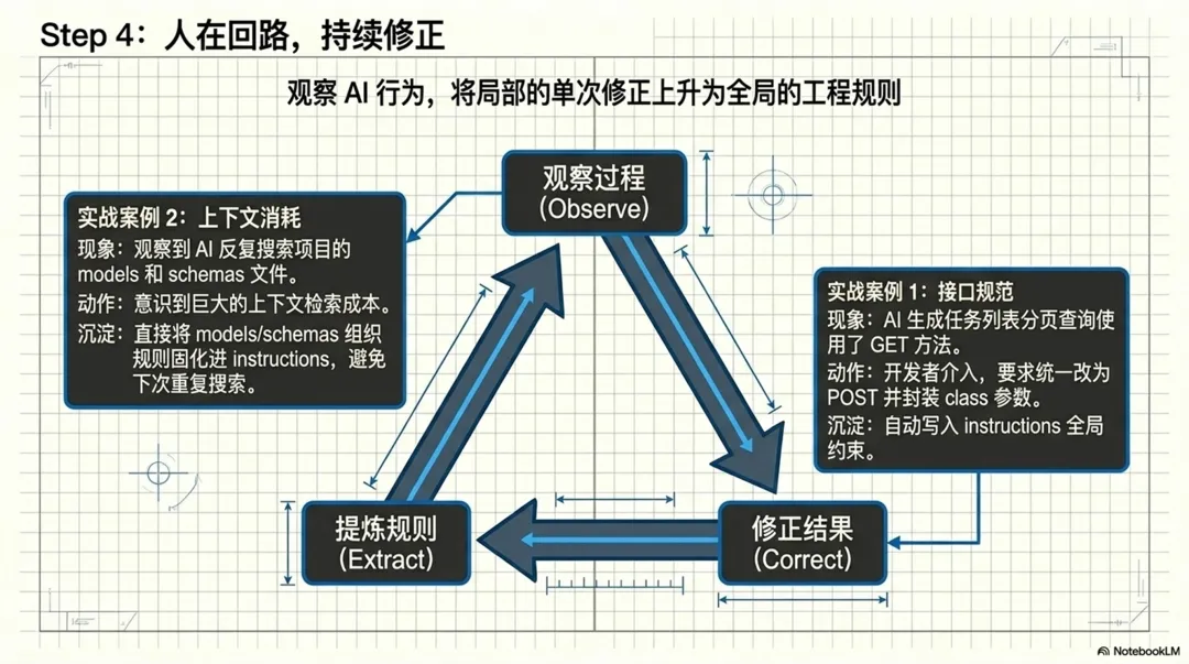 再进一步,在 AI 执行过程中持续观察。这一步很像技术负责人 review 一个工程师的工作,不是全程手把手干预,而是在关键节点发现问题、修正方向、抽取规则。很多优化点,不是一开始就能想全的,而是在观察 AI 的具体执行动作时发现的。